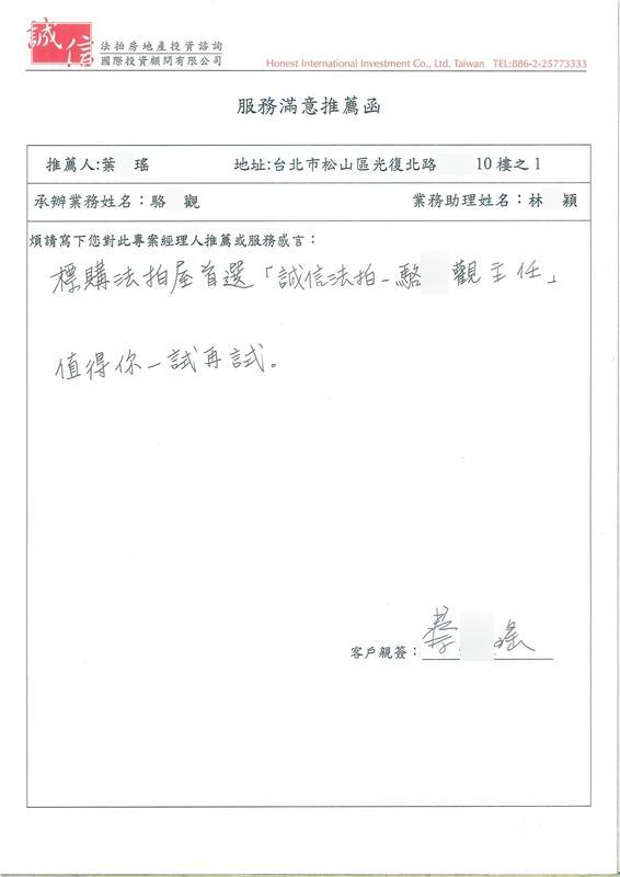 蔡小姐與夫婿都是投資房產的老手,買賣房屋多年,自己卻仍是無殼鍋牛,尋尋覓覓多年,始終找不到一間自己喜歡的房子,某一天的下午,在我看過光復北路這間產品後,在現場馬上致電給蔡小姐,請她與夫婿到現場看看,果然,地段與周邊環境都符合蔡小姐心目中的需求。 因為物件稀有,公司在接受蔡小姐的委託之後,專案小組迅速的爲蔡小姐調查周邊的價位行情,和債務人的狀況,務求給蔡小姐更精確的參考與判斷,在投標日當天,有60組人馬競爭,而蔡小姐以1799萬得標。