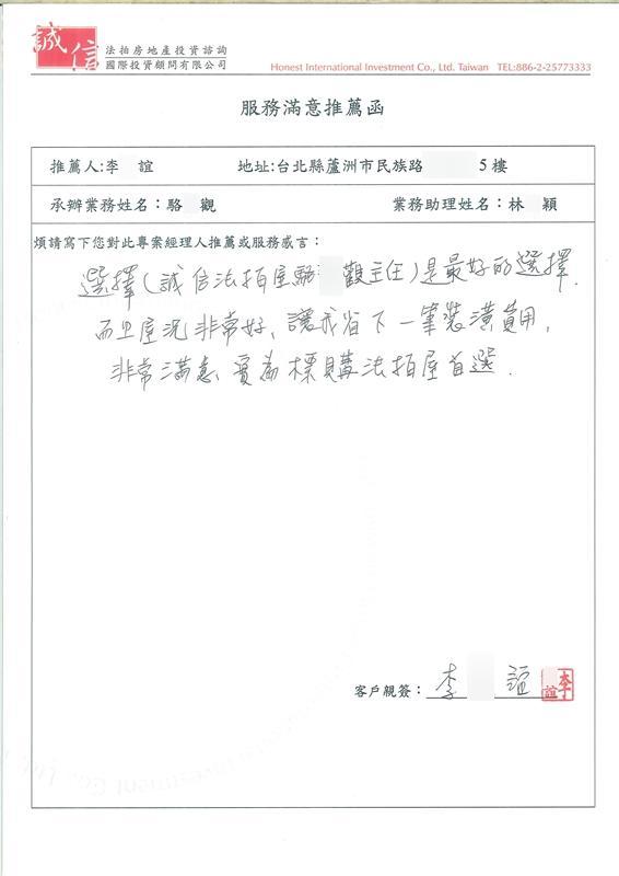 李小姐在6/12來電時,表示因為現在是租房子,想找蘆洲地區的法拍屋自住,在與李小姐多次訪談中,對李小姐心中的預算、想要的坪數與地段,有了確切的了解後,便著手為李小姐找尋適合物件,最後在帶李小姐看過蘆洲民族路這間房子後,李小姐和她女兒相當喜歡這間房子。 法院標購當天,在15人競標的情形下,以476萬得標,讓李小姐和她可愛的女兒擁有了一個自己的家。
